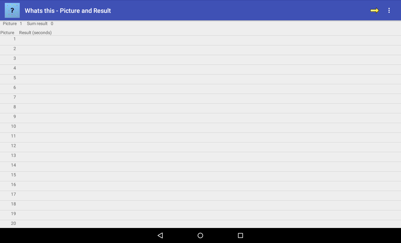 The picture and result list shows a list of numbers for each image to guess and the time it takes to guess if the image has already been guessed.